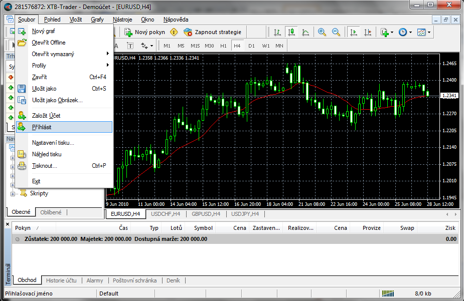 Nový demo účet spustíte otevřením platformy MetaTrader a kliknutím na Soubor -> Přihlásit, kam vyplníte zaslané přihlašovací údaje.