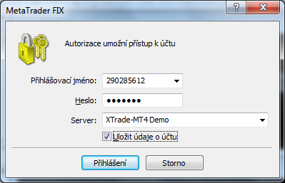 Vyplňte Vaše přihlašovací údaje, vyberte server Demo a stiskněte tlačítko Přihlášení. Pro uložení přihlašovacích údajů zaškrtněte políčko „Uložit údaje o účtu“. V případě, že tak neučiníte, platforma se vždy po spuštění bude dotazovat na Vaše přihlašovací údaje. Pokud se v pravém dolním rohu platformy objeví hlášení „Nesprávný účet“, zadali jste nesprávný login, heslo nebo server.