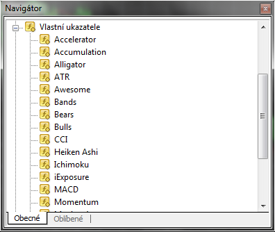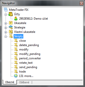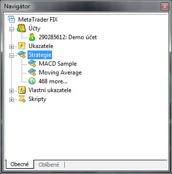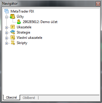 2 – Okno Navigátor, zobrazuje počet a typ nastavených účtů v platformě, technické ukazatele, strategie, vlastní ukazatele a skripty které má uživatel k dispozici.