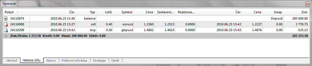 6 – Okno Terminál, zobrazuje aktuální hodnotu portfolia resp. otevřené obchody, historii účtu, poštovní schránku, zpravodajství a jiné.