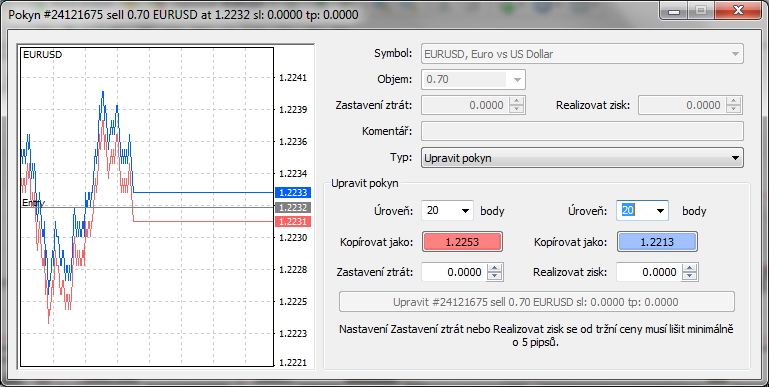 Nápověda: Při úpravě krátké pozice (prodej) MetaTrader automaticky nastavuje limitní úrovně ve správném směru a není nutné provádět složité výpočty.