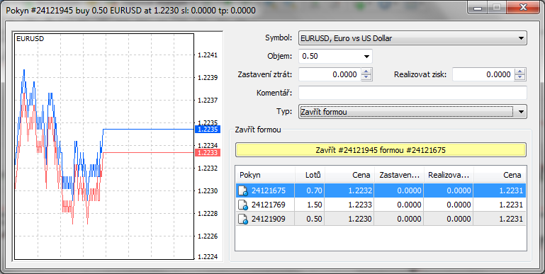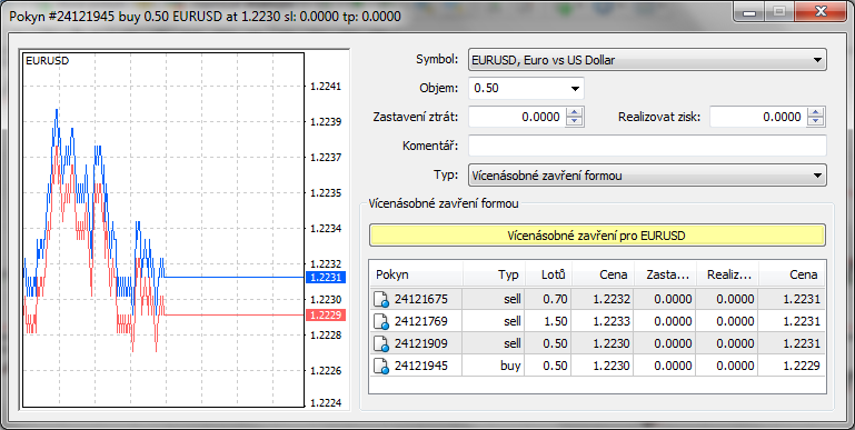 Vícenásobné zavření [instrument] | Funkce Vám umoţní zavřít všechny pozice najednou. |