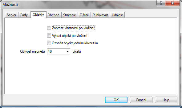 Zobrazit vlastnosti po vložení | Po vložení nového objektu, respektive indikátoru nebo jiného nástroje do aktivního grafu, investiční platforma zobrazí okno s vlastnostmi vkládaného objektu. |