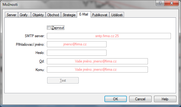 Zapnout | Povolí/znemožní import rozesílání e-mailů. Tato funkce slouží k odesílaní upozornění nebo informací vygenerované strategiemi, nebo upozorněním. |