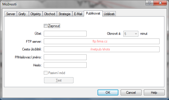 Zapnout | Povolí/znemožní publikování výpisů účtu (obchodní aktivity) do veřejného adresáře via FTP. |