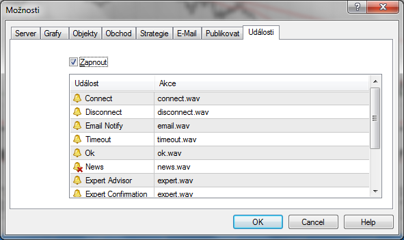 Akce | Upozornění na událost. Lze vybrat zvuky, nebo programy, které se automaticky spustí. |